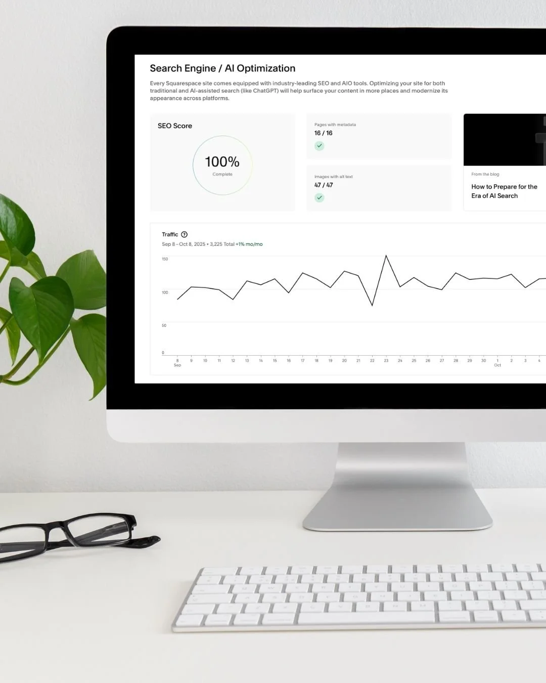 • Computer monitor displaying SEO and AI optimization data  | Squarespace Designer